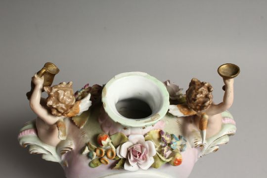 A CONTINENTAL PORCELAIN CUPID AND FLOWER ENCRUSTED CLOCK, with blue and white Roman numerals.