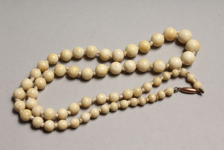 A GRADUATED IVORY BEAD NECKLACE of sixty one beads.