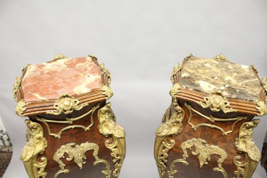 AN IMPRESSIVE PAIR OF FRENCH STYLE BURRWOOD, ORMOLU AND MARBLE PEDESTALS, in Louis XVI style.