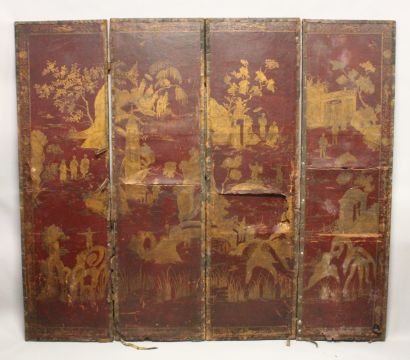 A GEORGE III LEATHER CHINESE DECORATED FOUR FOLD SCREEN.