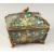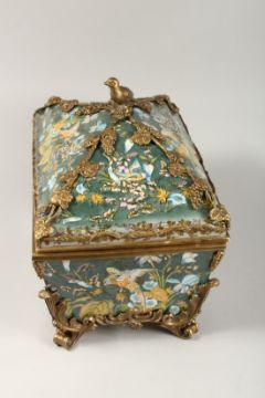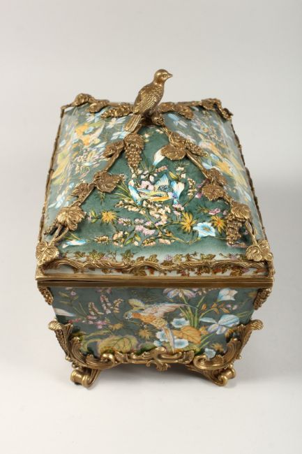 A LARGE CONTINENTAL STYLE PORCELAIN AND BRONZE MOUNTED CASKET, decorated with exotic flowers and birds, grape and vine mounts with bird finial.