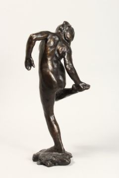 A BRONZE FEMALE FIGURE looking at the sole of her right foot.