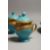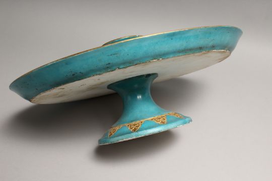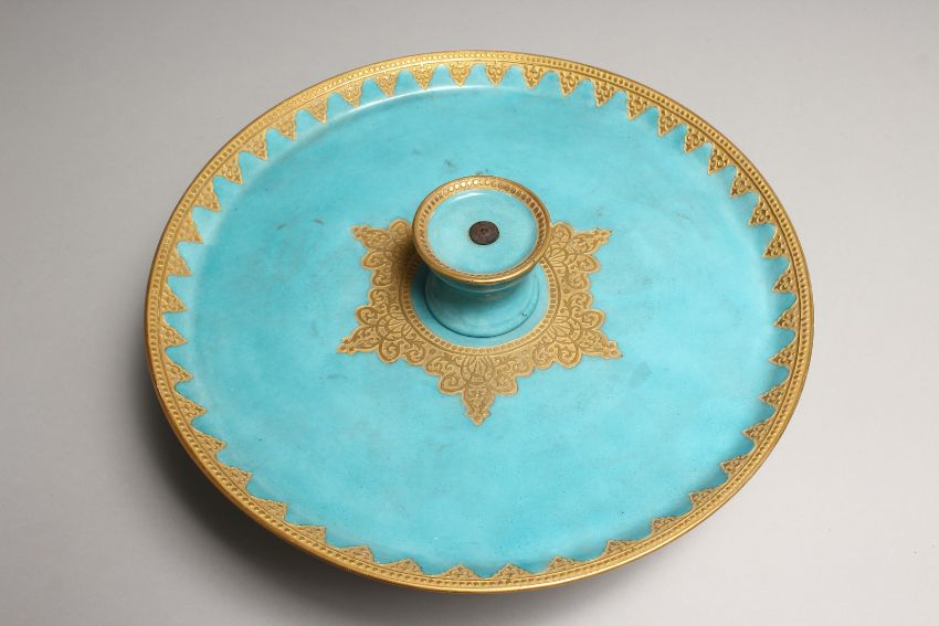 A CONTINENTAL LIGHT BLUE PORCELAIN CIRCULAR TURKISH - ISLAMIC DRINKS SET with gilt decoration, comprising comport, five cups and saucers