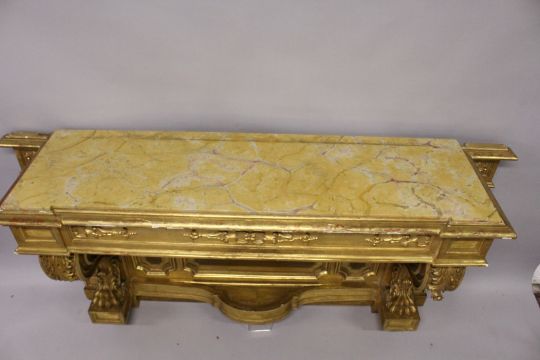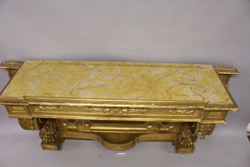 A SUPERB MATCHING 19TH CENTURY GILT WOOD CONSOLE TABLE with marble top, scrolling acanthus supports