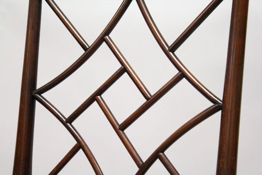 A GEORGE III MAHOGANY "COCKPEN" SIDE CHAIR with typical lattice back, overstuffed seat on plain turned legs united by stretchers.