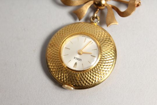 A URBEX 18CT GOLD NURSE'S FOB WATCH topped with a bow brooch