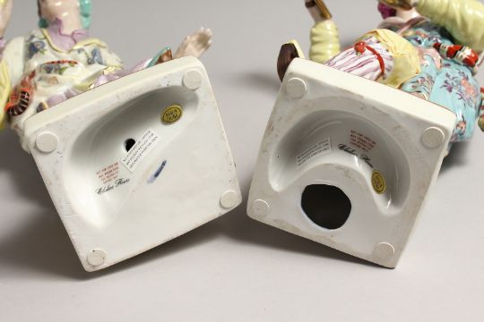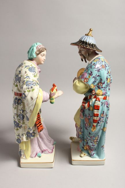A PAIR OF PORCELAIN FIGURES OF A CHINESE MAN AND WOMAN ON SQUARE BASES
