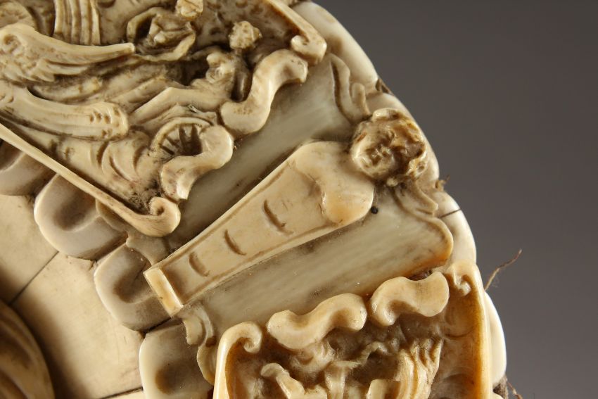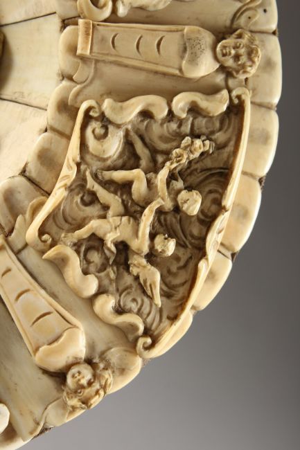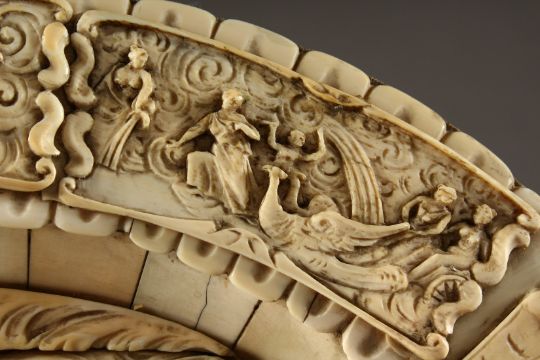 A SUPERB 18TH CENTURY EUROPEAN CARVED IVORY CIRCULAR DISH, the centre carved with nudes and dolphins, the border cupids, winged angel, birds, dolphins, etc.