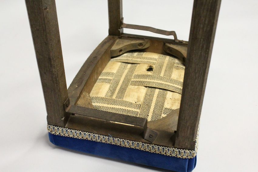 A GEORGE VI CORONATION STOOL with blue velvet seat by B North & Son.