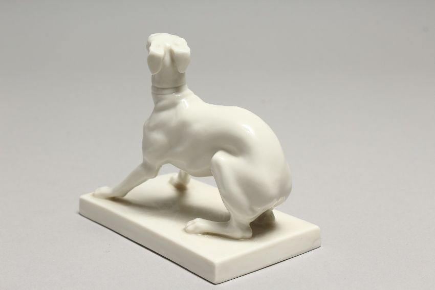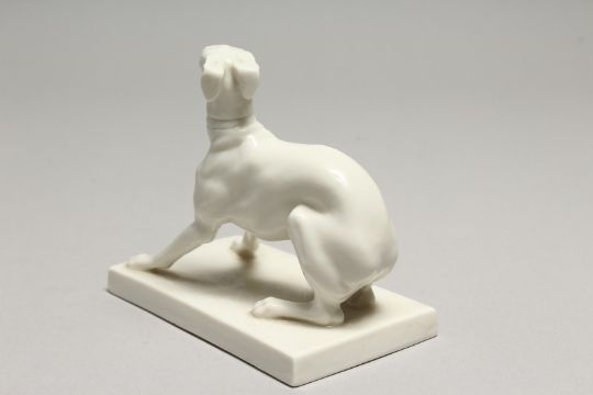 A GOOD NYMPHENBURG WHITE GLAZED PORCELAIN MODEL OF A SEATED UPRIGHT WHIPPET, AFTER P. J. MENE, on a rectangular base, printed and impressed marks to the base '759'.
