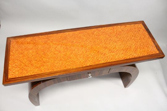 AN ART DECO STYLE ROSEWOOD CONSOLE TABLE, with a inlaid top, small drawer on curving supports