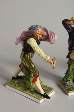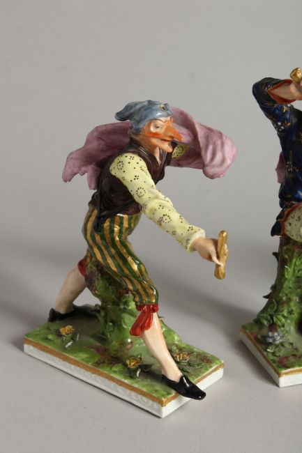 A SET OF FOUR "COMMEDIA DELL ARTE " STYLE FIGURES, LATE 19TH CENTURY/EARLY 20TH CENTURY, possibly by Samson, one musician and three with swords (A F)
