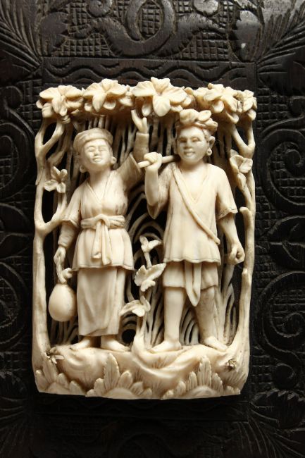 A GOOD CARVED AND PIERCED EUROPEAN IVORY OF A MAN AND A WOMAN IN AN ARBOUR.