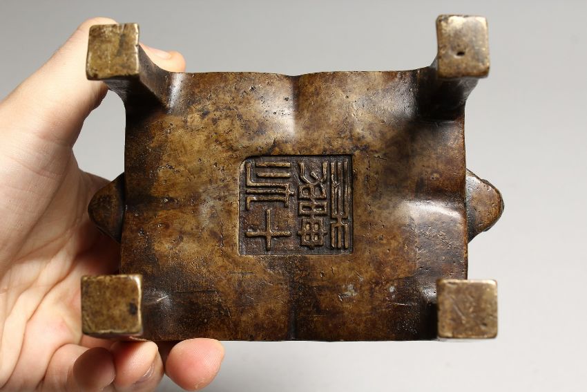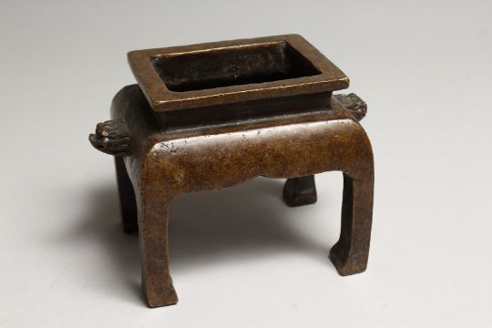 A CHINESE BRONZE RECTANGULAR CENSOR, on four curving legs
