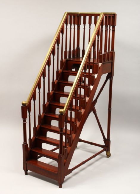 A GOOD MAHOGANY AND BRASS MODEL OF A STAIRCASE, with nine treads, platform top, brass mounted hand rail, turned spindles, on turned stretchered supports with brass casters.