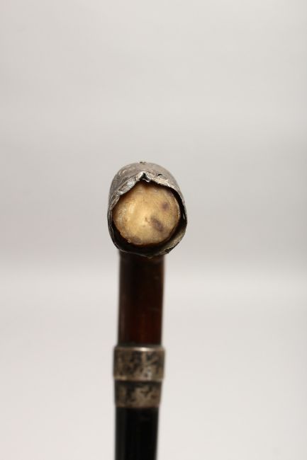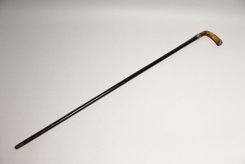 A VICTORIAN RHINO HANDLE WALKING STICK with silver band