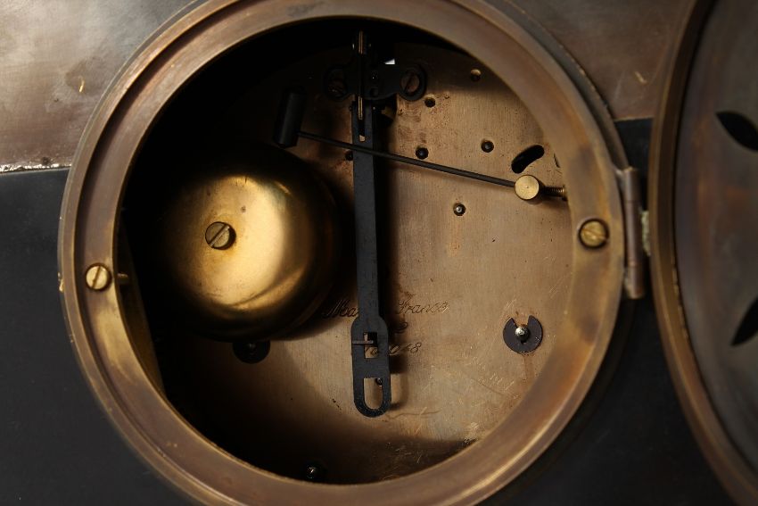 A LARGE FRENCH STYLE BRONZE AND GILT BRONZE MANTLE CLOCK, with eight day movement sticking a bell, the case with cherubs, playing musical instruments.