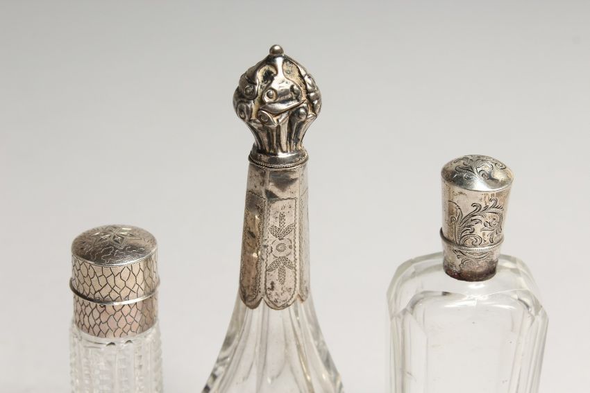 THREE GLASS SILVER TOP SCENT BOTTLES