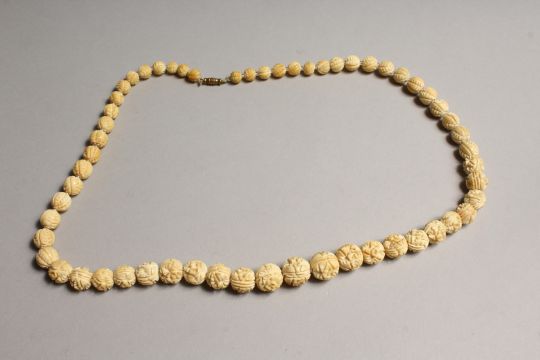 A CARVED IVORY GRADUATED BEAD NECKLACE on fifty eight beads