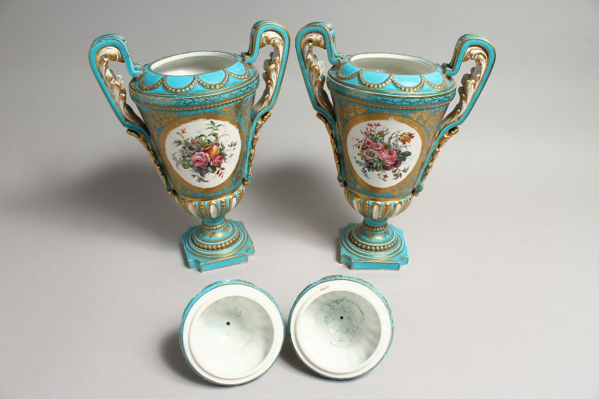 A SUPERB LARGE PAIR OF SEVRES PORCELAIN TWO HANDLED URN SHAPED VASES AND COVERS painted with reverse panels of figures and flowers.
