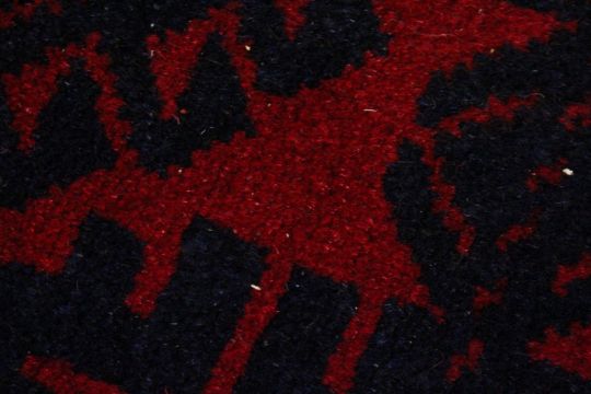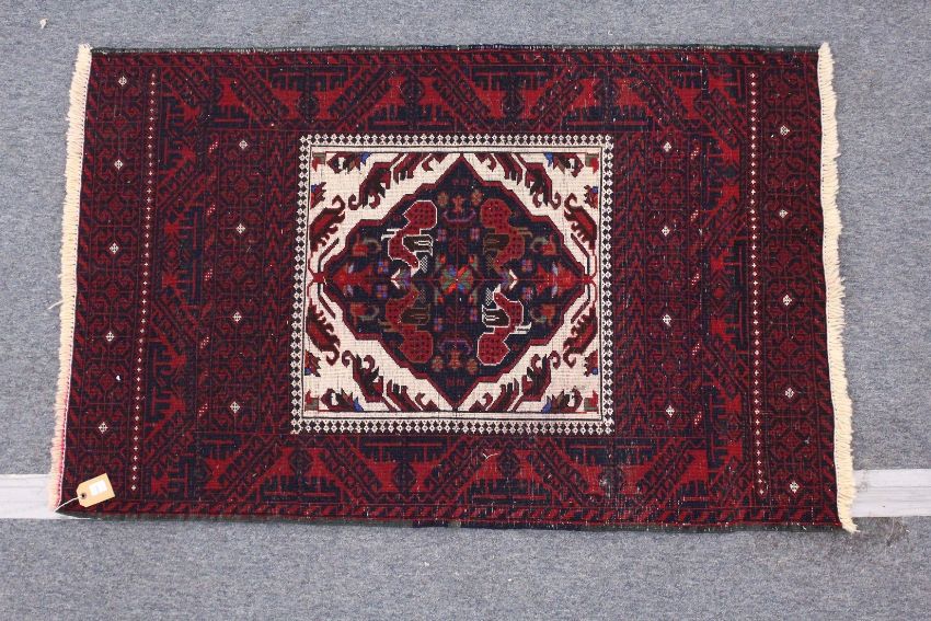 A PERSIAN RUG, 20th Century red ground with a central cream ground panel with stylised decoration.