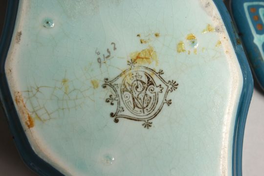 A SMALL ART NOUVEAU PORCELAIN BOX AND COVER, the blue ground with moulded stylised decoration