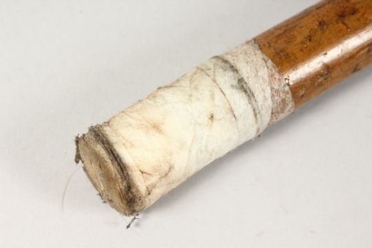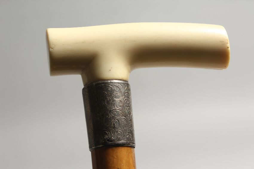 A GOOD VICTORIAN CARVED IVORY HANDLE WALKING STICK with silver band.