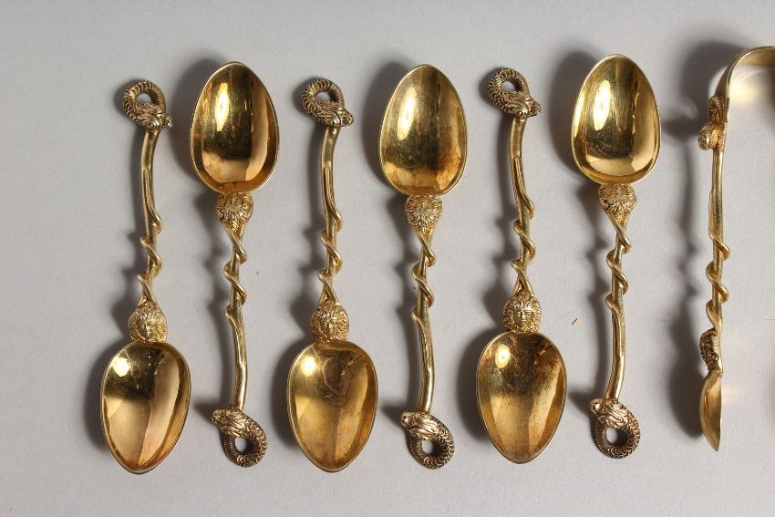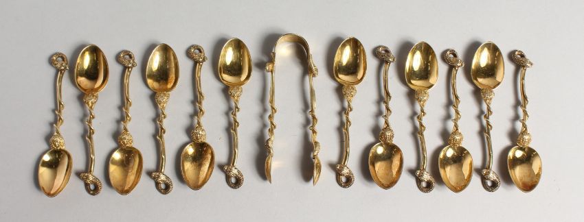 A GOOD SET OF TWELVE SILVER GILT TEA SPOONS with snake handles, and matching sugar nips. London 1901, maker J W F & C H (13)