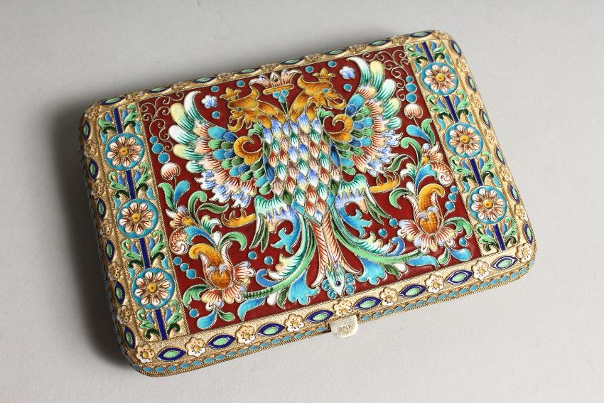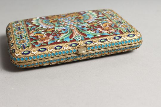 A SUPERB HEAVY RUSSIAN SILVER AND ENAMEL CIGARETTE CASE with double eagle
