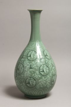 A KOREAN POTTERY BULBOUS VASE painted with storks