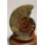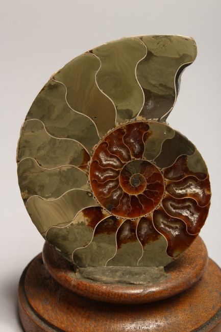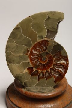 A POLISHED CROSS-SECTION OF AN AMMONITE FOSSIL on a stand.