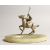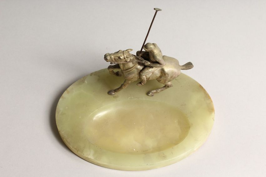 AN ONYX OVAL SHAPED DESK STAND, moulded with a model of a polo player on horseback