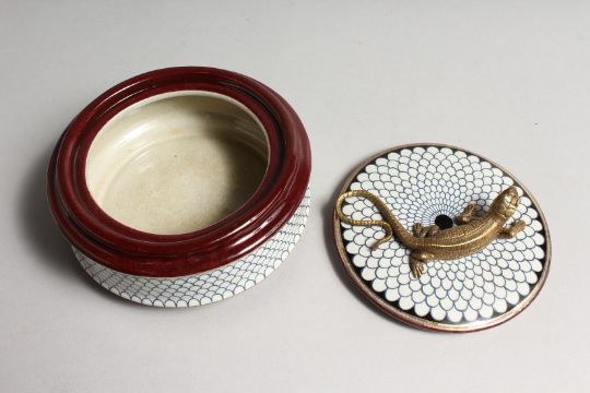 A CIRCULALR PORCELAIN BOX AND COVER with bronze lizard