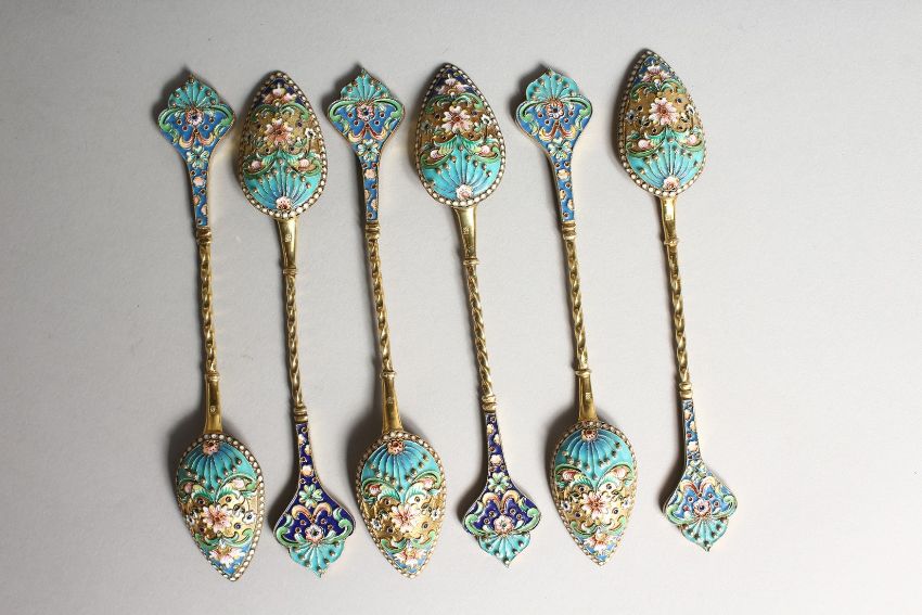 A SET OF SIX RUSSIAN SILVER AND ENAMEL SPOONS