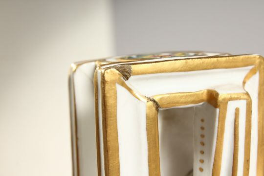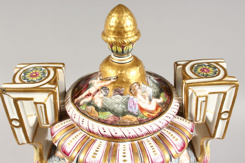 A SUPERB LARGE CAPODIMONTE TWO HANDLED URN SHAPE VASE AND COVER with gilt ground, with classical figures in relief.