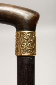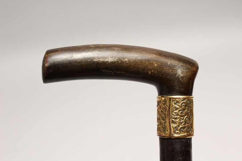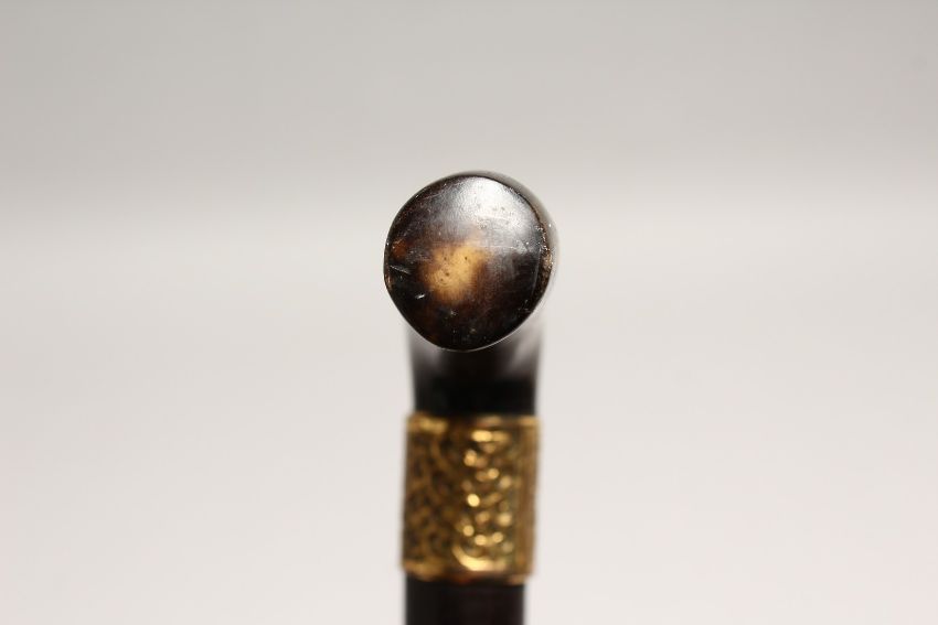 A RHINO HANDLE VICTORIAN WALKING STICK with gilt band