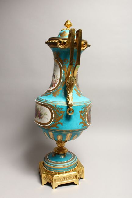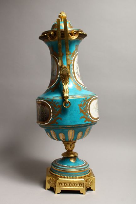 A GOOD LARGE 19TH CENTURY SEVRES PORCELAIN AND ORMOLU TWO HANDLED VASE AND COVER, the light blue ground painted with reverse panels of figures, birds and flowers.