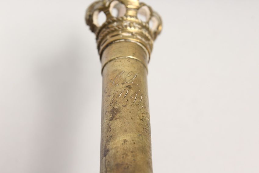A 19TH CENTURY TURNED WOOD AND BRASS TIPSTAFF, the top asa crown with a cross.