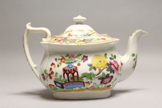 A POTTERY TEAPOT painted in the Oriental syle.