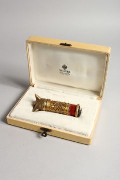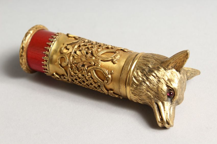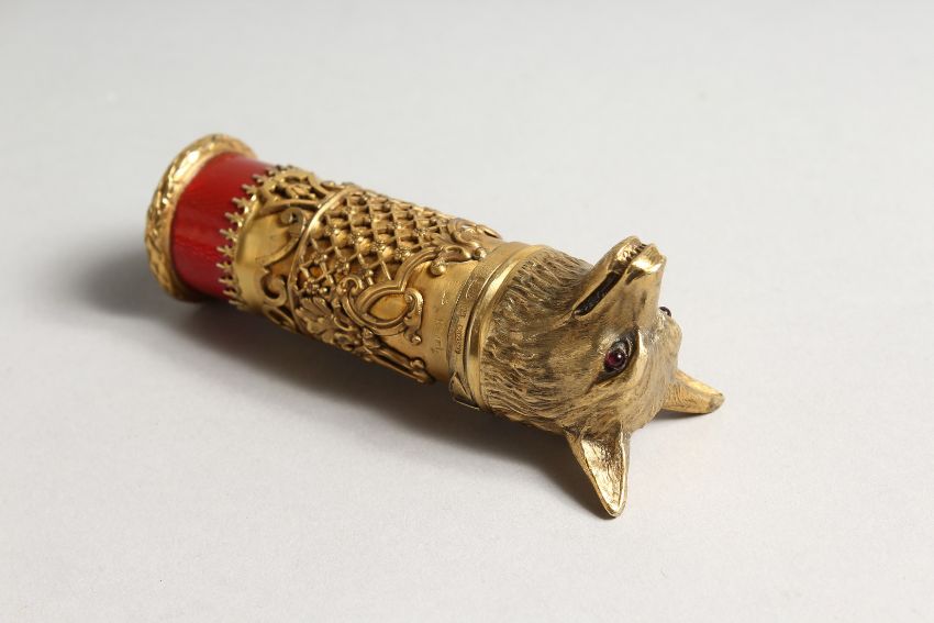 A SUPERB "FABERGE" SILVER AND ENAMEL FOX'S HEAD WALKING STICK HANDLE