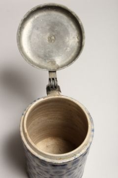 A LARGE GERMAN WESTERWOLD TANKARD, with pewter lid and geometric decoration