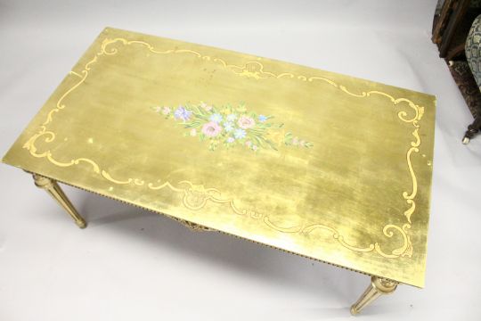 A 20TH CENTURY DECORATIVE GILTWOOD LOW TABLE, with floral painted decoration, on turned tapering legs.