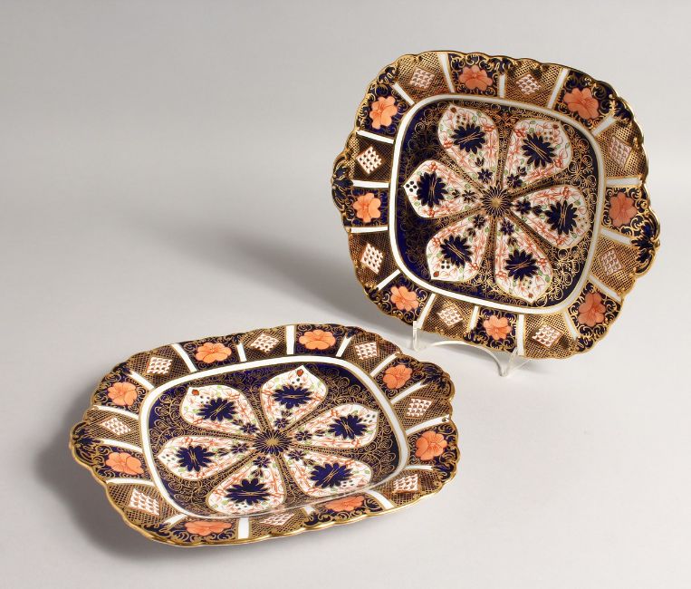 A PAIR OF CROWN DERBY JAPAN PATTERN SQUARE DISHES