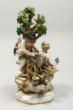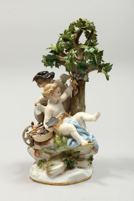 A GOOD MEISSEN PORCELAIN GROUP, CUPID BENEATH A TREE sharpening an arrow and a cherub holding an axe.
