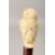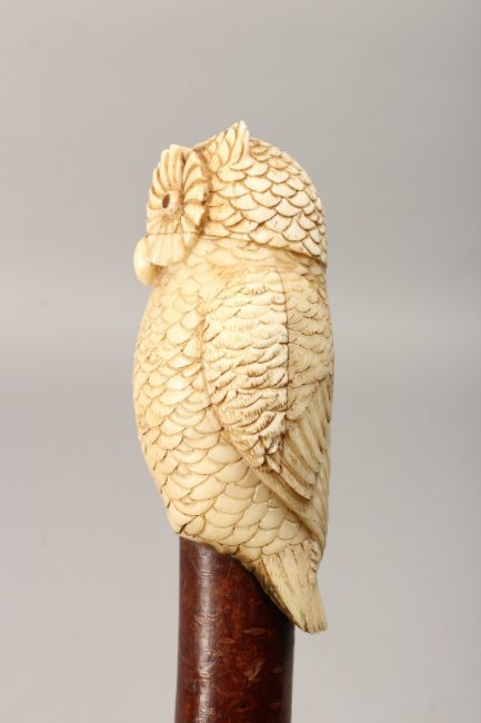 A VERY GOOD 19TH CENTURY CARVED IVORY OWL, RUSTIC WALKING CANE