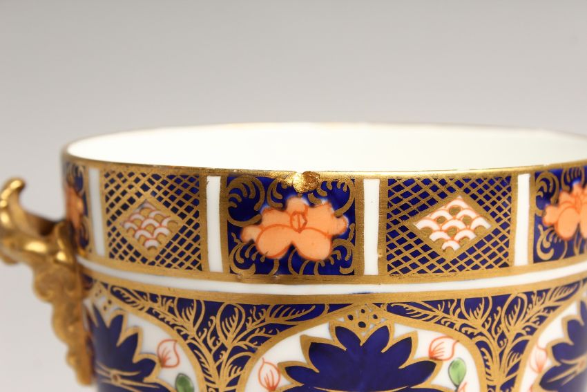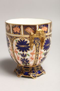 A ROYAL CROWN DERBY JAPAN PATTERN TWO HANDLED OVAL SHAPED VASE.