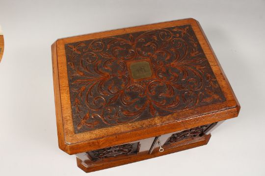 A GOOD VICTORIAN CARVED OVAL TABLE TOP CABINET, the top and doors with carved decoration, the interior with four graduated long drawers