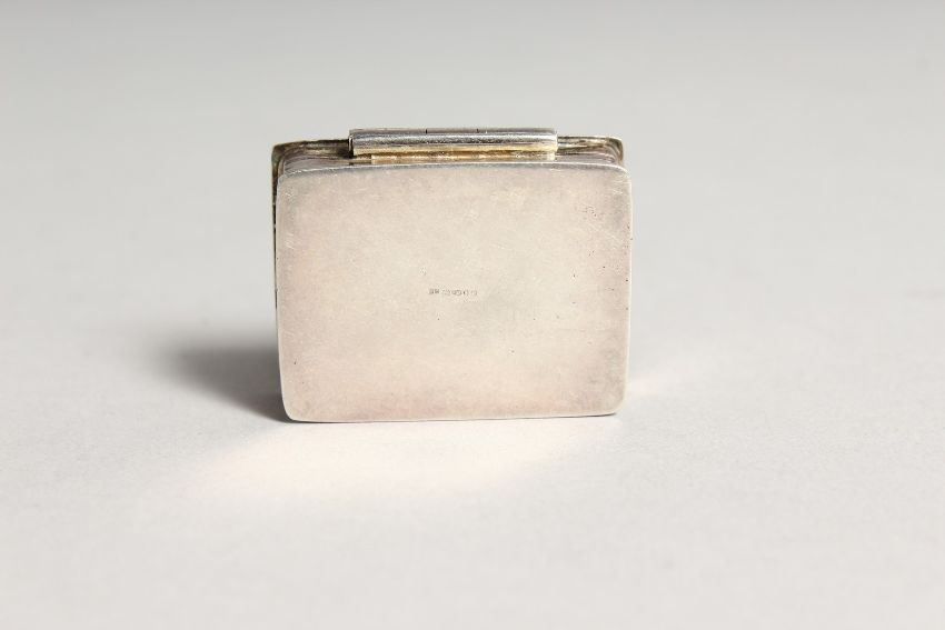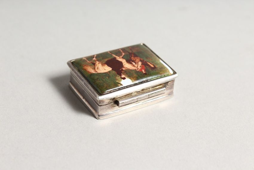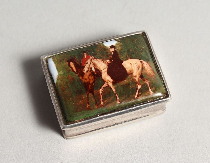 A SILVER AND ENAMEL SNUFF BOX, the lid decorated with figures on horseback.