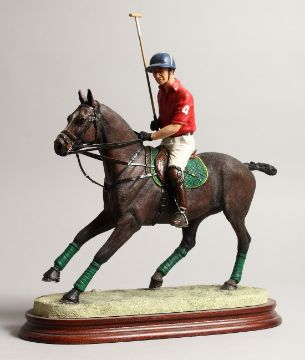 BORDER FINE ARTS. A model of a polo player on a bay horse, model.no. B0875, mounted on a wooden plinth.