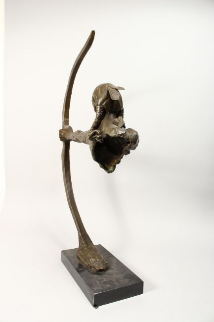 AN UNUSUAL BRONZE FIGURE DEPICTING THE TORSO OF A NATIVE AMERICAN INDIAN, his left arm and hand outstretched holding a bow, on a rectangular marble base.